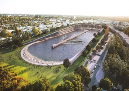 تعمل شركة للهندسة المعمارية في أستراليا، على مشروع إنشاء مركب مائي حضري هائل في مدينة بيرث الاسترالية، عن طريق تحويل ملعب لكرة القدم إلى بركة أمواج عملاقة.
