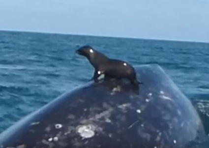 سرقت فقمة من الزمن لحظات عندما وقفت على ظهر حوت في عرض المحيط، قبل أن تقفز من على ظهره في الماء، وتمكن أحد السائحين من توثيق تلك اللحظات في مياه شبه جزيرة باخا كاليفورنيا في شمال غرب المكسيك.