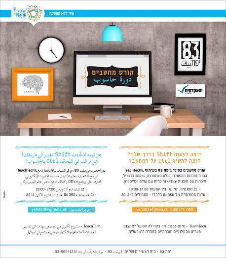 لذلك، يعلن ييفت 83، مركز الشباب في يافا عن افتتاح دورة حاسوب للكبار وذلك ابداء من يوم الاثنين القادم الموافق 30.11 . مدة الدورة 12 لقاء ومدة كل لقاء ساعتين.