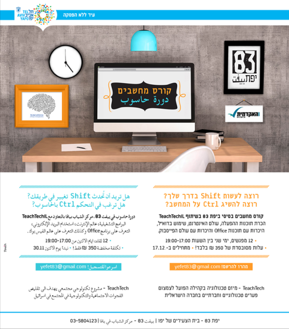 لذلك، يعلن ييفت 83، مركز الشباب في يافا عن افتتاح دورة حاسوب للكبار وذلك ابتداء من يوم الاثنين القادم الموافق 7-12-2015 الساعة الخامسة مساء. مدة الدورة 12 لقاء ومدة كل لقاء ساعتين.