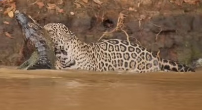 ظهر النمر يقفز في النهر ويتصارع مع التمساح، ثم يقبض عليه بأسنانه الحادة فيما يراقبه بعض السياح الذين صوروا المعركة.