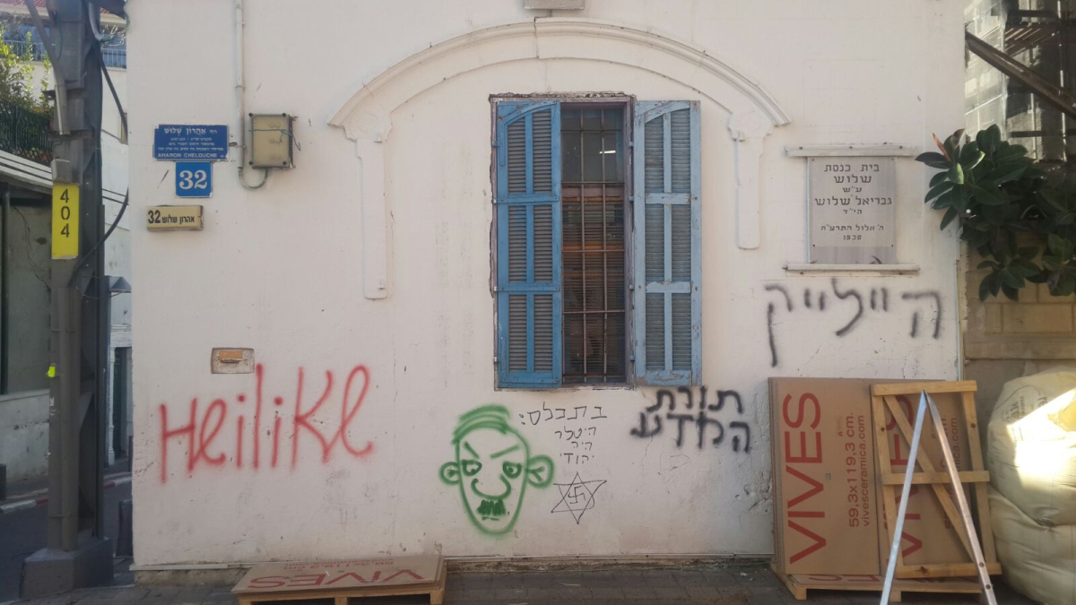 قبل فتره قصيره من ظهيرة اليوم الثلاثاء بتل ابيب شارع "اهرون شلوش "تم الكشف عن خط كتابات جرافيكية على جدران عدد من المباني على طول خط الشارع هذا وعلى جدران احد المباني الذي يستخدم وبمثابة كنيس تم الخط فيما خط ورش من العبارات : " هاي لايك "بالعبرية والانجليزيه و" هتلر كان يهوديا "بالعبريه وبالجوار منهن تم رسم يحاكي وجة النازي المأفون " ادولف هتلر " .
