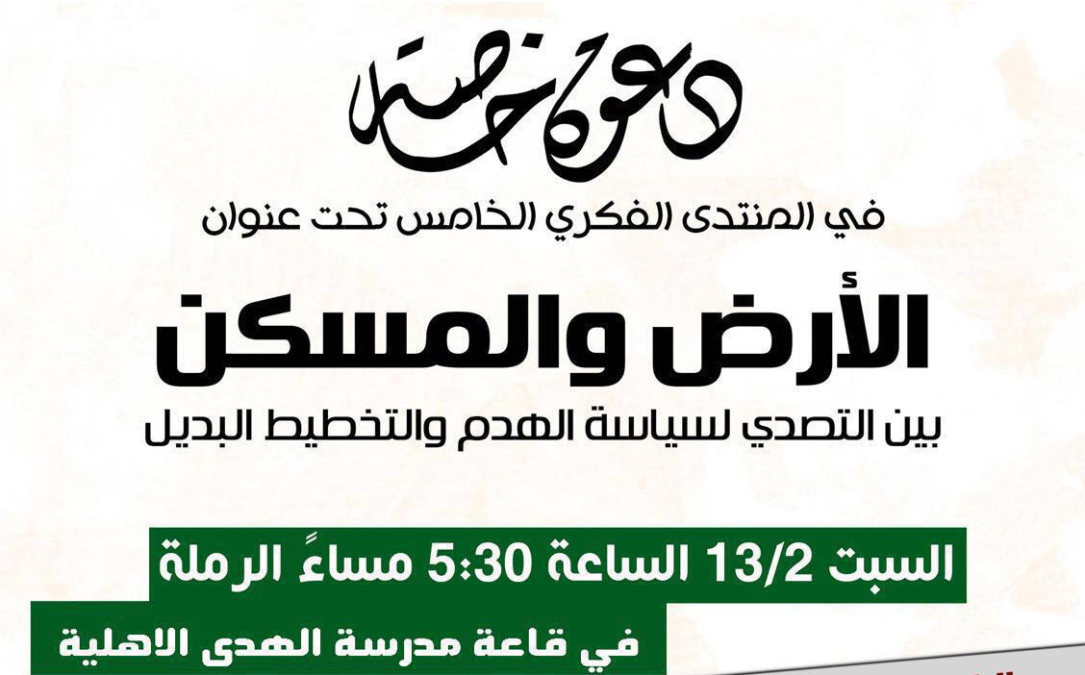دعوة: السبت - منتدى فكري تحت عنوان "الأرض والمسكن" في مدينة الرملة