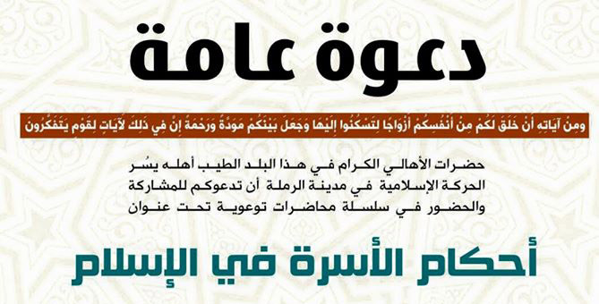 الحركة الاسلامية في الرملة تُنظم سلسلة ندوات ومحاضرات بعنوان "أحكام الاسرة في الاسلام"