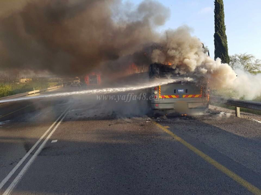 بالصور: إحتراق حافلة ركاب قرب الرملة دون وقوع اصابات
