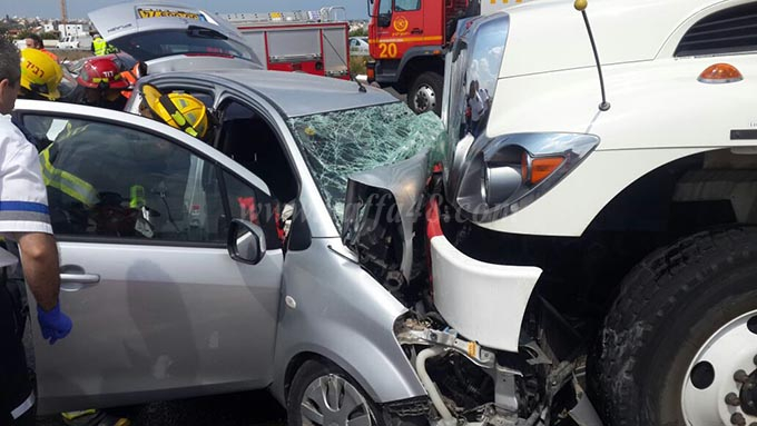 صور: اصابة خطيرة بحادث طرق بين مركبة وشاحنة قرب مدينة الرملة