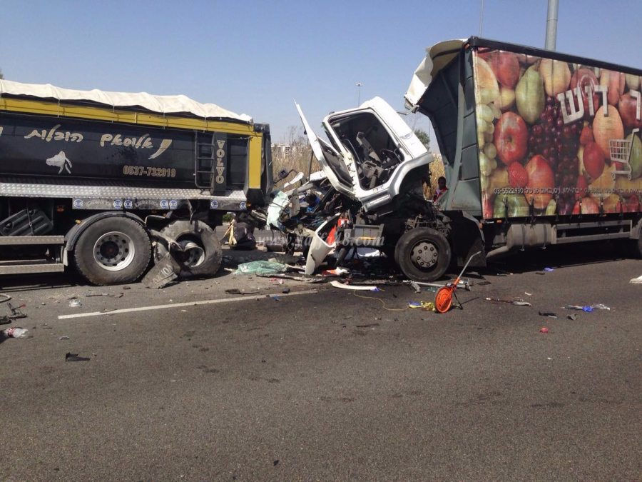 بالصور: مصرع شخص واصابة آخر بحادث طرق مروّع بين شاحنتين قرب الرملة