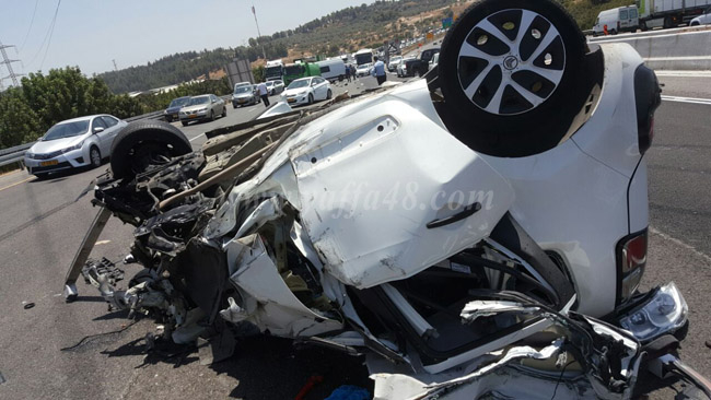 بالصور: 3 إصابات متوسطة بحادث مروع وانقلاب مركبة قرب اللد