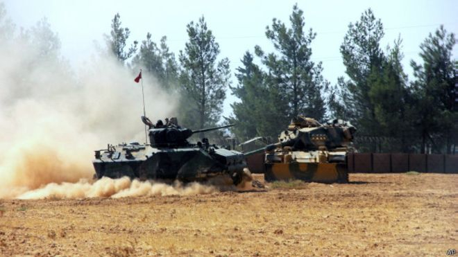 عبرت دبابات تركية إلى سوريا في إطار حملة عسكرية تشنها تركيا "لطرد مسلحي تنظيم الدولة من مواقعهم في شمالي سوريا"، في عملية عسكرية أطلق عليها اسم "درع الفرات".