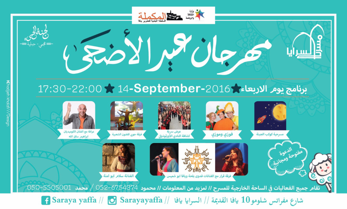 ينظم كل من لجنة الحي عجمي- جبلية ومسرح السرايا العربي- في تعاونٍ غير مسبوق على الصعيد الثقافي بين جميع المؤسسات اليافية، مهرجان عيد الأضحى المبارك. وهو مهرجان فنّي ثقافي وترفيهي يجري في اليومين الثاني والثالث لعيد الأضحى المبارك، ويشتمل على مسرحيّات وعروض للأطفال، أمسيات وعروض موسيقية، دبكة، أناشيد وبسطات متنوعة ومختلفة.