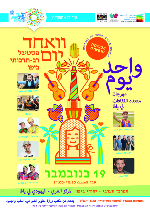 الاحتفال بدعم من وزارة تطوير الضواحي، النقب والجليل وبالتعاون مع قسم العروض في بلدية تل أبيب يافا للاحتفال معا بحلول يوم التسامح العالمي ونبذ العنف في مجتمعنا.