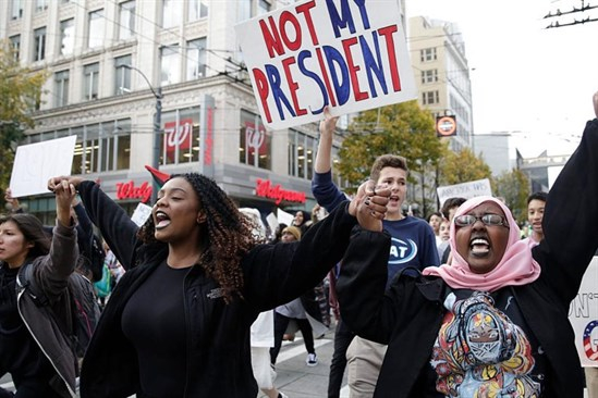 وخرج عشرات الآلاف في مسيرات في مدن من نيويورك إلى لوس أنجلوس في تجمعات معظمها سلمية منذ فوز ترامب المفاجئ، الثلاثاء الماضي، على المرشحة الديمقراطية هيلاري كلينتون.