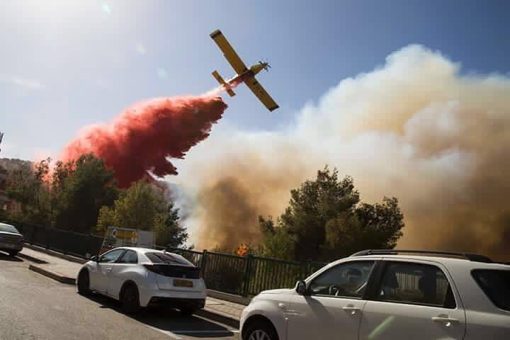 واستدعت قوات الاطفاء تعزيزات جوية للسيطرة على النيران التي تكاد تلتهم حي " رمات سفير".