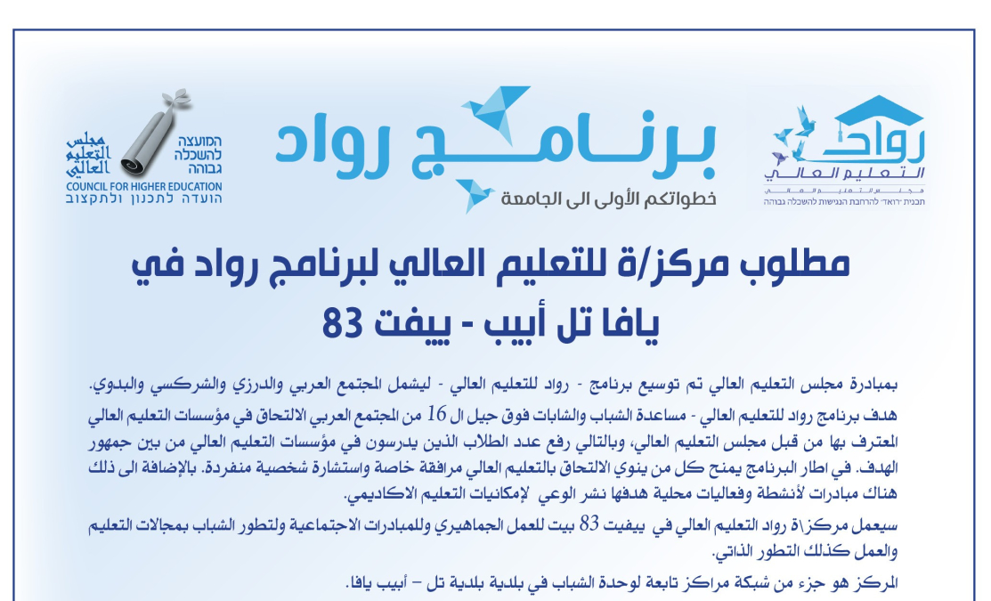 مطلوب مركز/ة للتعليم العالي لبرنامج رواد في مركز ييفت 83 بيافا