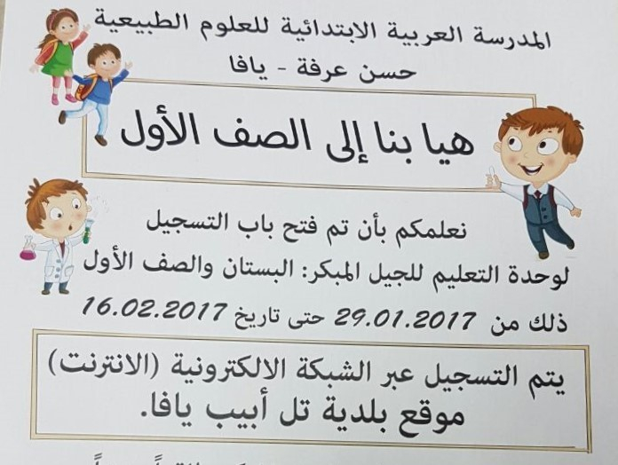 أعلنت المدرسة العربية الابتدائية للعلوم الطبيعية "حسن عرفة - يافا" عن افتتاح التسجيل لوحدة التعليم للجيل المبكر : البستان والصف الأول، وذلك ابتداءً من تاريخ 29-1-2017 وحتى تاريخ 16-2-2017.