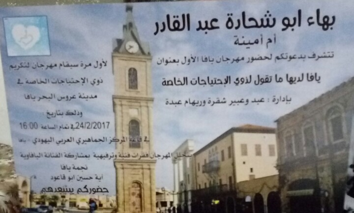 وصل موقع يافا 48 دعوة الاهالي الى المشاركة في مهرجان تكريم ذوي الاحتياجات الخاصة بمدينة يافا، وذلك يوم الجمعة الموافق 24-2-2017 في تمام الساعة الرابعة عصراً في المركز الجماهيري بمدينة يافا.