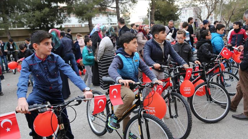 وزّعت دار الإفتاء في ولاية سيعرت جنوب شرق تركيا اليوم الأحد، 80 دراجة هوائية لأطفال تتراوح أعمارهم بين 7 و 17 عاماً، في إطار حملة "ارتاد المسجد للصلاة واجمع النقاط لتربح دراجة".