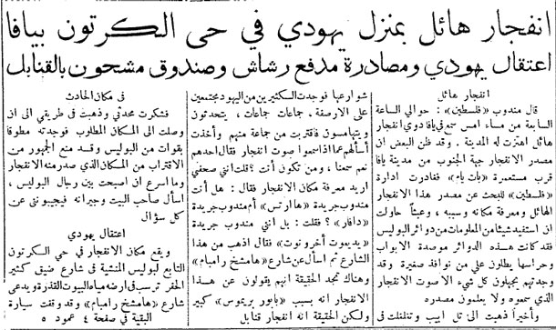 قال مندوب فلسطين: حوالي الساعة السابعة من مساء امس سمع في يافا دوي انفجار هائل اهتزت له المدينة. وقد ظن البعض أن مصدر الانفجار جهة الجنوب من مدينة يافا قرب مستعمرة "بات يام" فغادرت ادارة "فلسطين" البحث عن مصدر هذا الانفجار الهائل ومعرفة مكانه وسببه ، وعبثا حاولت أن تستفيد شيئا من المعلومات من دائرة البوليس فقد كانت هذه الدائرة موصدة الأبواب وحراسها يطلون علي من نوافذ صغيرة وقد وجدتهم يجهلون كل شيء الا صوت الانفجار الذي سمعوه ولا يعلمون مصدره.