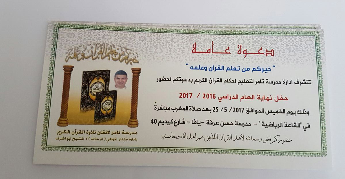 تتشرف إدارة مدرسة تامر لتعليم أحكام القرآن الكريم في مدينة يافا بدعوتكم لحضور حفل نهاية العام الدراسي 2016 - 2017 وذلك يوم الخميس الموافق 25-5-2017 بعد صلاة المغرب مباشرة.