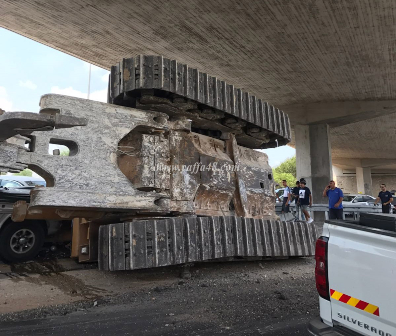 بالصور: جرافة ضخمة تسقط عن شاحنة وتتسبب بحادث قرب اللد