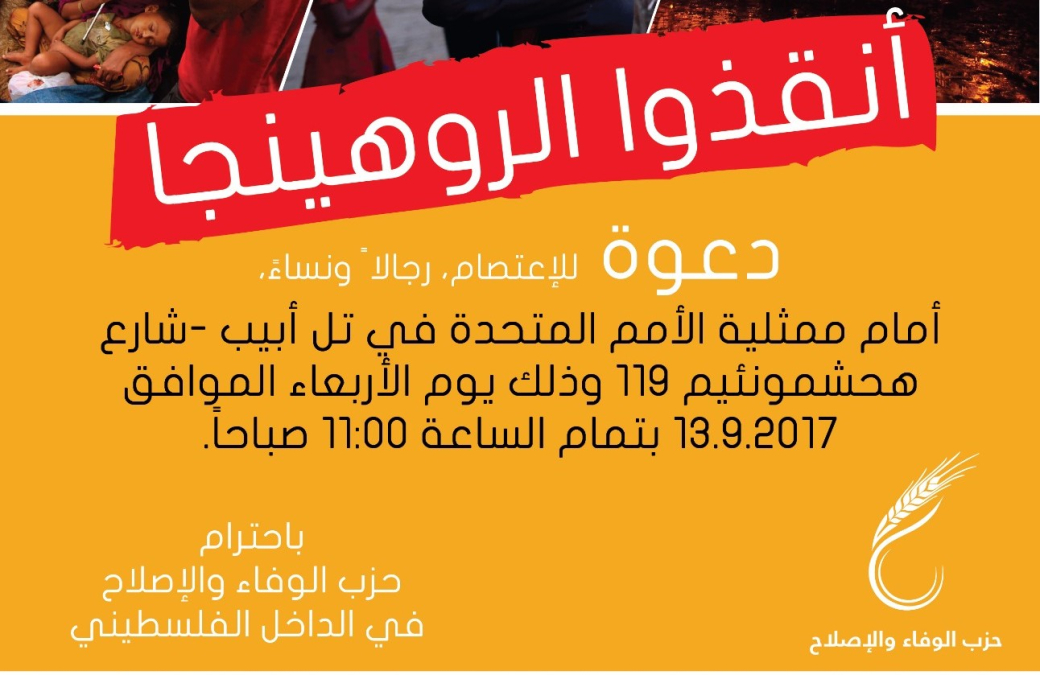 يدعوكم بهذا حزب الوفاء والاصلاح في الداخل الفلسطيني الى المشاركة في الاعتصام "رجالاً ونساءً" أمام ممثلية الأمم المتحدة في تل ابيب يافا "هحشمونئيم 119"، وذلك يوم الاربعاء الموافق 13-9-2017 في تمام الساعة الـ11:00 صباحاً.