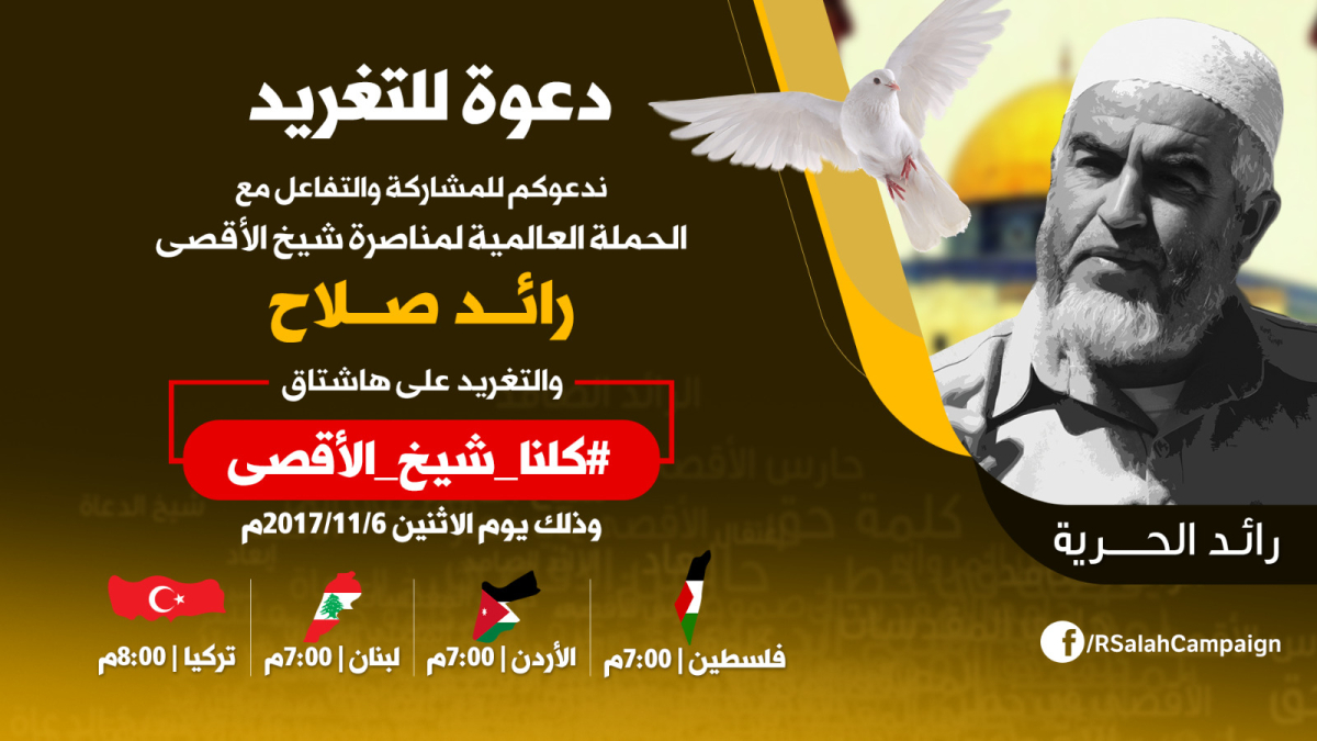 وتستمر الحملة التي تحمل وسم “#كلنا_شيخ_الأقصى” إلى 12 تشرين الثاني/ نوفمبر الجاري وسيتخللها العديد من الفعاليات والأنشطة الرسمية والشعبية والإعلامية.