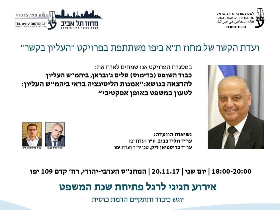 تستضيف نقابة المحاميين في مدينة يافا قاضي المحكمة العليا سليم جبران وذلك في لقاء مفتوح سيُعقد يوم الاثنين المقبل بين الساعات الـ18:00 والـ20:00 في قاعة المركز العربي اليهودي، الكائن في شارع كيدم 109 بيافا.