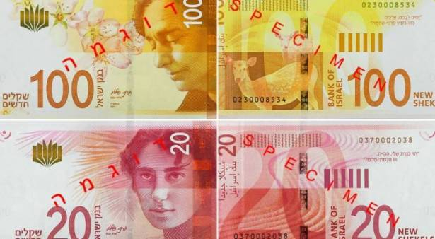 الورقة النقدية الجديدة من فئة 20 شيكل تحمل صورة الشاعرة راحيل بلوبشتاين، لونها أحمر وطولها 129 ملم. الورقة النقدية من فئة 100 شيكل تحمل صورة الشاعرة ليئا جولدبرغ، لونها برتقالي وطولها 143 ملم.
