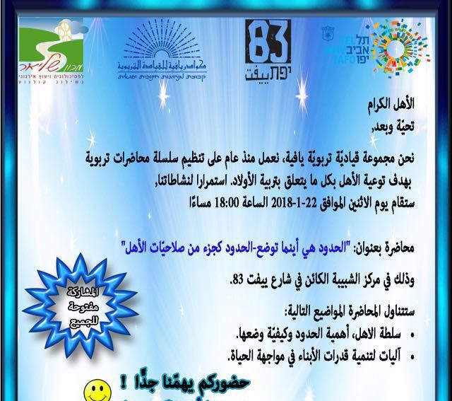 وذلك يوم الاثنين الموافق 22-1-2018 من الساعة 18.00 وحتى الساعة 19:30 في مركز الشبيبة ييفت 83 بيافا.
