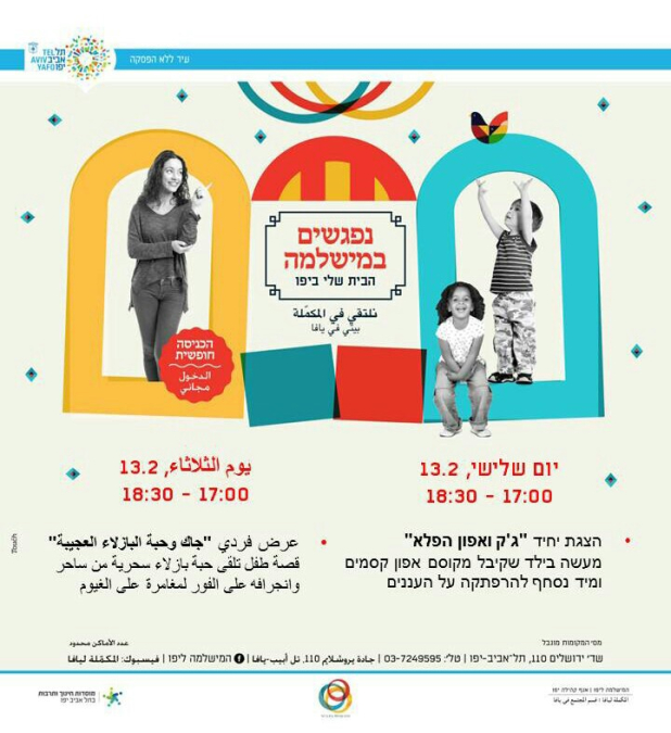 ينظم قسم المجتمع في المكملة ليافا الثلاثاء فعاليات شيّقة للأطفال في مبنى المكملة ليافا ، حيث ستنطلق الفعاليات في تمام الساعة 17:00 وتستمر لغاية 18:30.