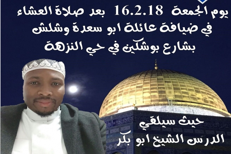 تدعوكم خيمة الهدى الدعوية في مدينة يافا للمشاركة مساء اليوم الجمعة في الدرس الديني الذي ستنظمه الخيمة في شارع بوشكين في حي النزهة بضيافة عائلتي ابو سعدة وشلش، وسيكون ضيّف اللقاء الشيخ ابو بكر.