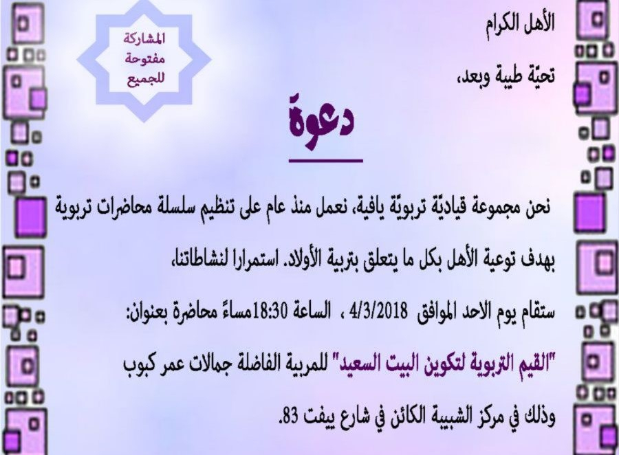 نحن مجموعة قياديّة تربوية يافية، نعمل منذ عام على تنظيم سلسلة محاضرات تربوية بهدف توعية الأهل بكل ما يتعلق بتربية الأولاد، واستمراراً لنشاطاتنا ستُقام يوم غدٍ الأحد 4-3-2018 الساعة 18.30 مساءً محاضرة بعنوان "القيم التربوية لتكوين البيت السعيد" للمربية الفاضلة جمالات عمر كبوب.