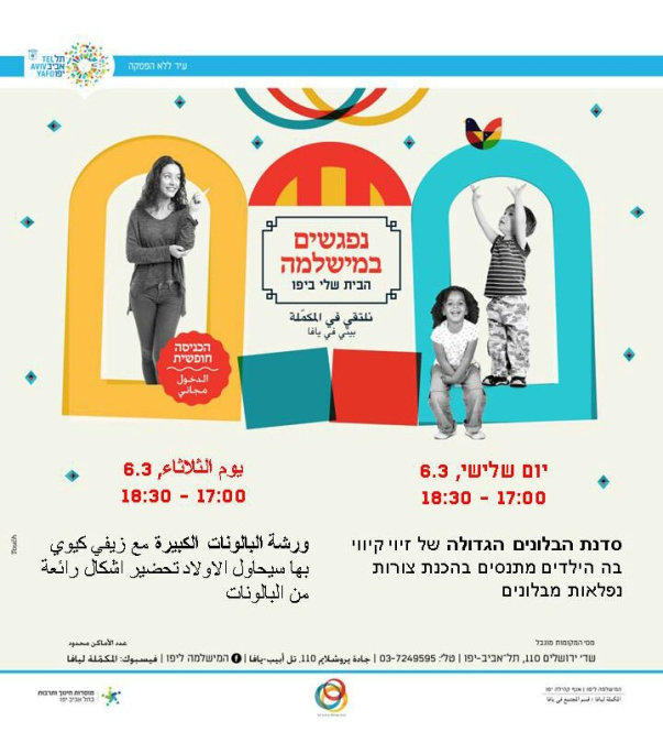 ينظم قسم المجتمع في المكملة ليافا الثلاثاء فعاليات شيّقة للأطفال في مبنى المكملة ليافا ، حيث ستنطلق الفعاليات في تمام الساعة 17:00 وتستمر لغاية 18:30.