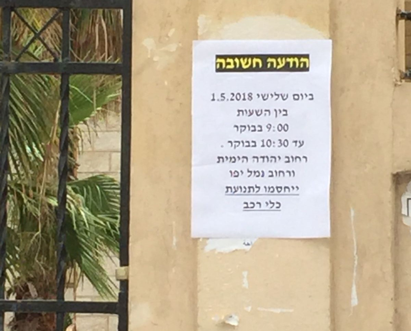 أعلنت البلدية وشرطة السير عبر لافتة تم تعليقها في شارع يهودا هيميت صباح اليوم، أنه سيتم اغلاق شارع الميناء وشارع يهودا هيميت يوم الثلاثاء المقبل 1-5-2018.