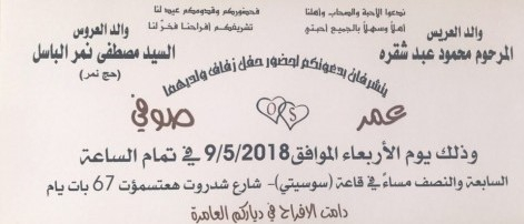 أعلنت عائلة الشاب عمر محمود عبد شقرة عن تأجيل حفل زفافه الذي كان مقررا يوم الاربعاء المقبل 9-5-2018 الى أجل غير مسمى بعد، وذلك بسبب وفاة السيدة مريم ابو سيف "ام عباس" احدى قريبات العروس.