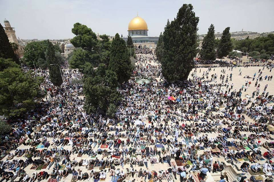 وامتلأت مساجد الأقصى المسقوفة والمظلات والأروقة والمناطق المشجرة وباحات المسجد بالمصلين الذين توافدوا اليه من ساعات الصباح من مدينة القدس والداخل الفلسطيني وكافة المدن الفلسطينية، فيما حرم الشبان الذين تقل أعمارهم عن الأربعين عاما من الدخول الى القدس والوصول الى الأقصى بسبب قيود السلطات الاسرائيلية.