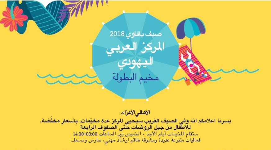 ثلاثة افواج من مخيم البطولة بتكلفة مخفضة برعاية بلدية تل أبيب يافا تشمل رحلات مشوقة: بارك الجزيرة، ليجو بارك، سينما سيتي، أيام سباحة في البركة وغيرها من الفعاليات المتنوعة: