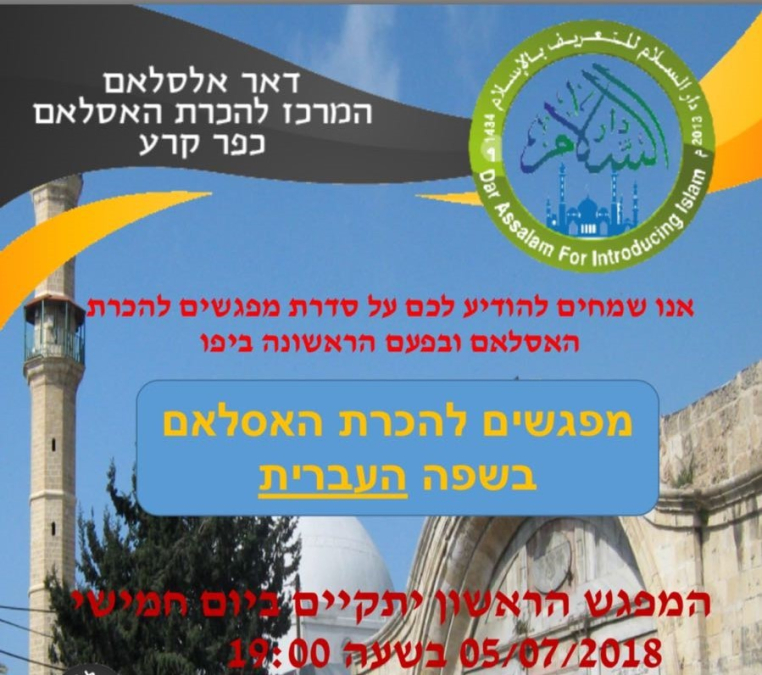 سيُقام يوم الخميس الموافق 5-7-2018 درس ديني باللغة العبرية للتعريف بالاسلام وذلك في مركز الدعوة بجوار مسجد المحمودية في مدينة يافا، وذلك في تمام الساعة السابعة مساءً.