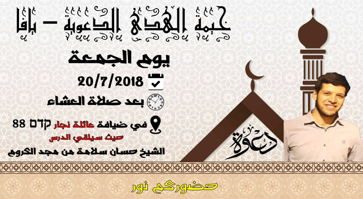 تدعوكم خيمة الهدى الدعوية في مدينة يافا للمشاركة يوم غدٍ الجمعة في الامسية الايمانية التي ستُنظمها الخيمة في ضيافة عائلة نجار، وذلك بعد صلاة العشاء مباشرة.
