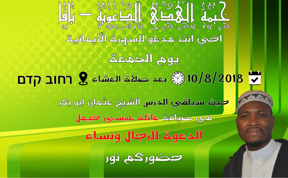 تدعوكم خيمة الهدى الدعوية في مدينة يافا للمشاركة يوم غدٍ الجمعة في الامسية الايمانية التي ستُنظمها الخيمة في ضيافة عائلة عيسى خيمل وذلك بعد صلاة العشاء مباشرة.
