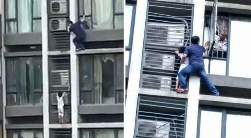 تسلّق رجل 7 طوابق بطريقة بطولية، لإنقاذ طفله العالق بالطابق السابع في المبنى الواقع بغوانغدونغ في الصين.