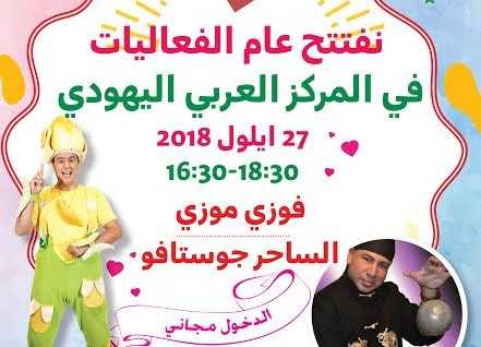 يدعوكم المركز العربي اليهودي لافتتاح عام الفعاليات باستضافة فوزي موزي والساحر جوستابو ، وذلك يوم غد الخميس 27/9 بين الساعات 16:30-18:30 في القاعة الرياضية التابعة للمركز.