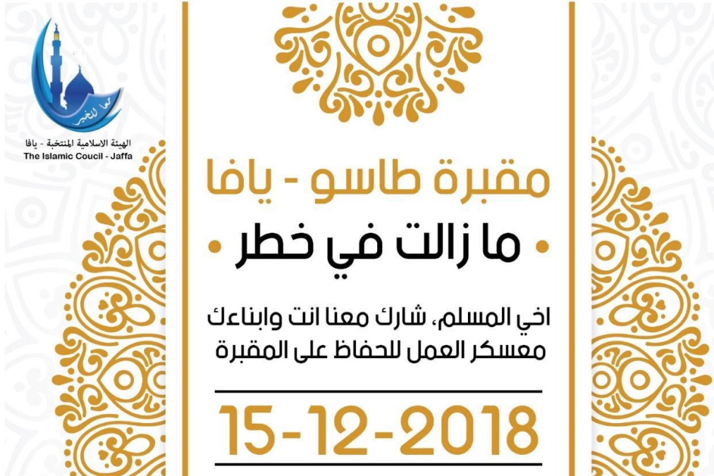 دعت الهيئة الاسلامية المنتخبة في مدينة يافا الأهالي في المدينة لأوسع مشاركة في معسكر العمل للحفاظ على مقبرة طاسو والذي سيتم تنظيمه يوم السبت الموافق 15.12.2018 بالتعاون مع لجنة المتابعة العليا للجماهير العربية في الداخل الفلسطيني.