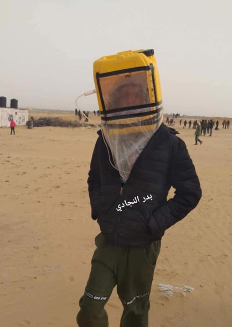وظهر في الصورة المنشورة على حساب مراسل القناة العبرية، شاب فلسطيني، يرتدي غالونا بلاستيكيا اقتطع الجزء الأسفل منه، وتم تفريغ الجانب المواجه له ووضع بلاستيك شفاف أمامه بهدف الرؤية، وتم تجهيزه بخراطيم، تمكن مرتديه من التنفس، خلال القاء الجيش الإسرائيلي للغاز المسيل للدموع، أثناء المسيرات.