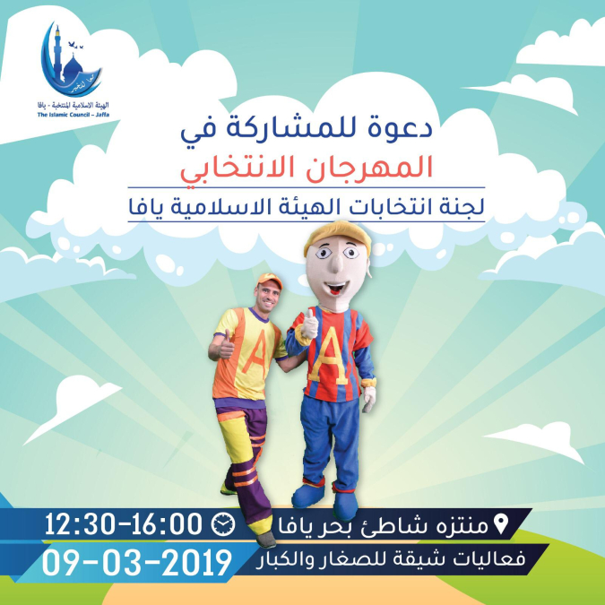 تقيم لجنة الانتخابات التابعة للهيئة الاسلامية المنتخبة في مدينة يافا، اليوم في تمام الساعة 12 ظهراً في متنزه العجمي بمدينة يافا، المهرجان الشيق والممتع للأطفال، وتدعو اللجنة أولياء الأمور لاصطحاب أطفالهم للمشاركة في المهرجان.