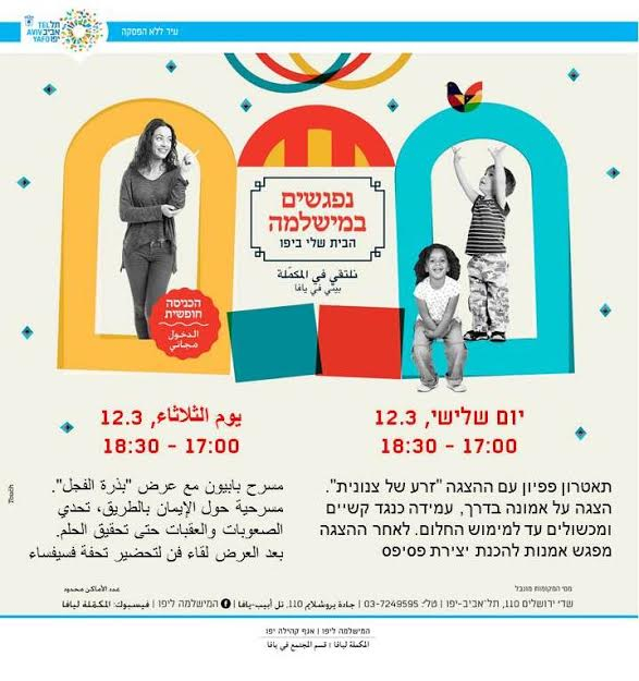 ينظم قسم المجتمع في المكملة ليافا الثلاثاء فعاليات شيّقة للأطفال في مبنى المكملة ليافا ، حيث ستنطلق الفعاليات في تمام الساعة 17:00 وتستمر لغاية 18:30.