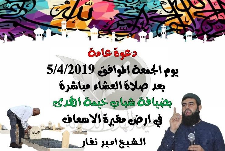 تدعوكم خيمة الهدى الدعوية في مدينة يافا للمشاركة مساء يوم الجمعة في الأمسية الايمانية التي ستُنظمها في أرض مقبرة الاسعاف بمدينة يافا، وذلك بعد صلاة العشاء مباشرة.