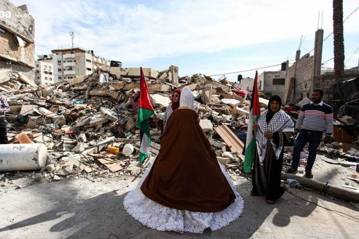 بالقرب من منزلها المدّمر غرب مدينة غزة وعلى ركام عمارة سكنية، زُفّت العروس الفلسطينية شيماء الحويطي (20 عامًا)، ليخطّ الغزيون للتاريخ من جديد دروساً في التشبث بالحياة .