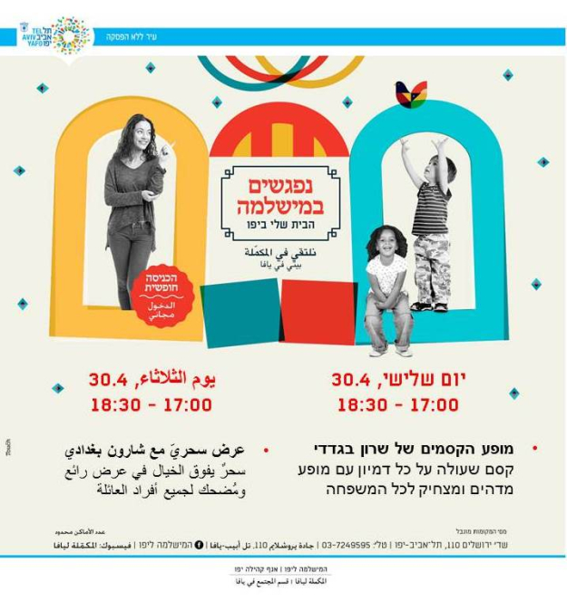 ينظم قسم المجتمع في المكملة ليافا الثلاثاء فعاليات شيّقة للأطفال في مبنى المكملة ليافا ، حيث ستنطلق الفعاليات في تمام الساعة 17:00 وتستمر لغاية 18:30.