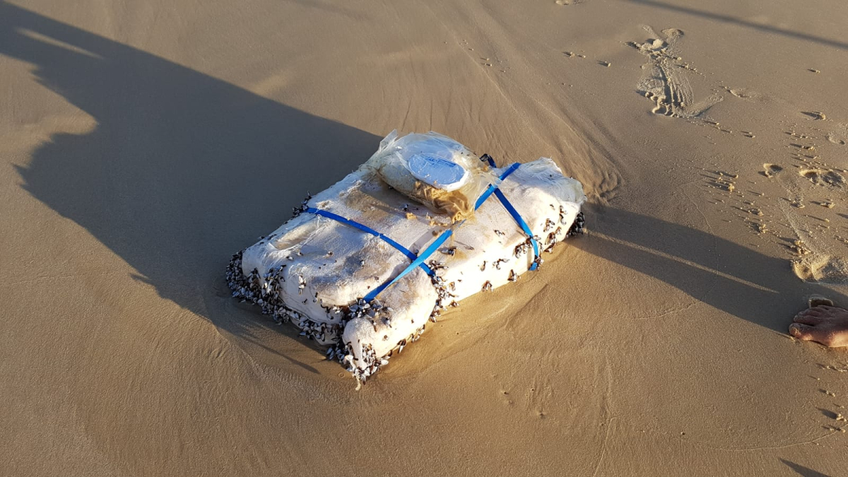 تم نقل الكيس لفحصه في تحقيقات الشرطة التي بدأت في محاولة للكشف عن مصدر الشحنة ، وقالت انها قضت وقتاً طويلاً في البحر حتى وصلت الى الشاطئ.